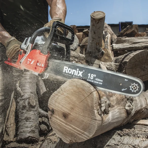اره درخت بر بنزینی 45 سانتیمتری رونیکس مدل 4647، ابزار حرفهای با موتور 49.3 سیسی دو زمانه و توان 1.9 کیلووات. مجهز به سیستم روغنکاری خودکار، ترمز ایمنی، استارت هوشمند و سیستم ضد لرزش. مناسب برای باغداری، هرس درختان و کارهای جنگلداری متوسط.